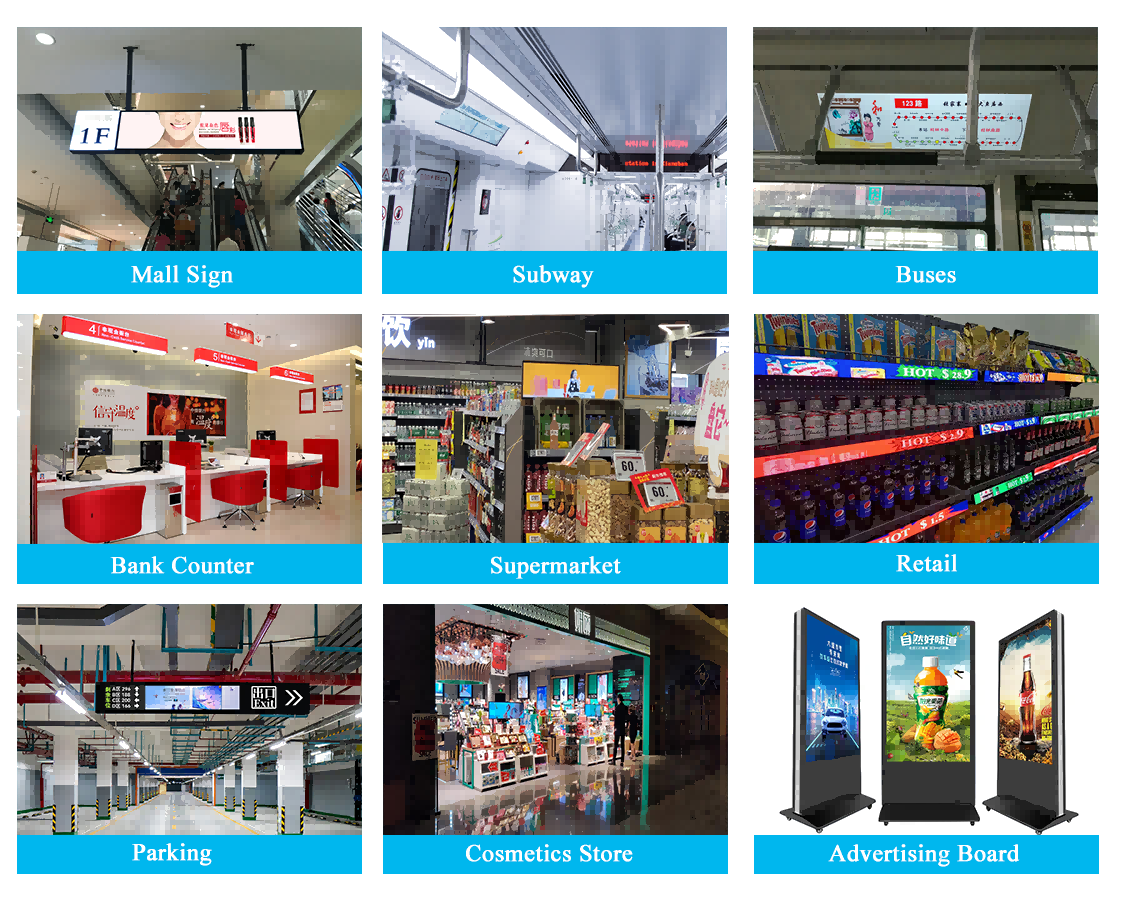 1.Подифікувати та цифрові вивіски: Він встановлюється на полицях супермаркетів, магазинів зручностей та торгових центрів для просування продукту та дисплея з етикеткою цін.