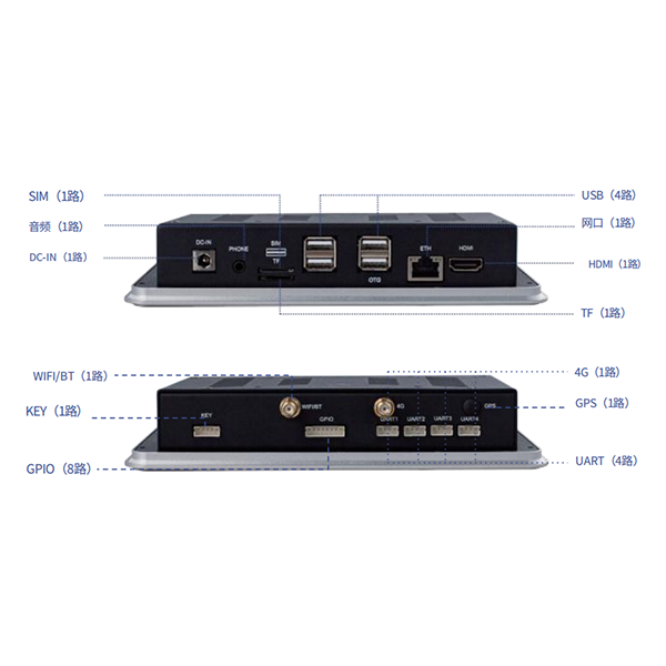 Кілька USD (2,0/3.0), послідовний порт (RS-232/485/422, Essential), Gigabit Ethernet Port, Display, вихід (VGA, HDMI, DP-FOR або резервна копія), GPIO, аудіо, вхід живлення (DC-in, зазвичай 12V/24V широко введення)